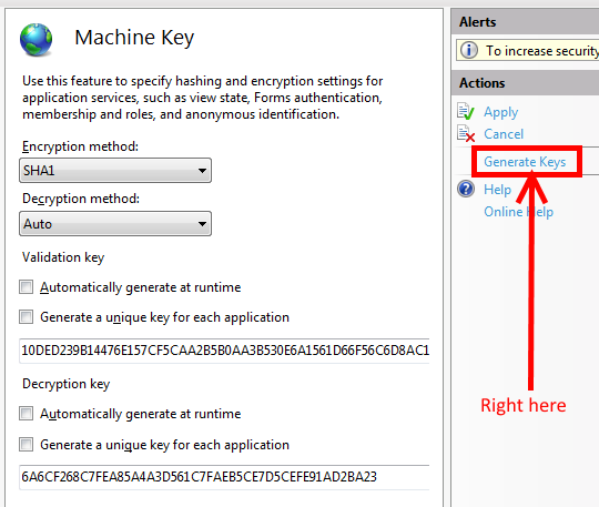 These two keys are confusingly hidden inside a section within IIS named “Machine Keys”. However these keys are application level scoped, so they are nothing to do with your machine! So fire up IIS, and within the ASP.NET section find the machine keys icon: